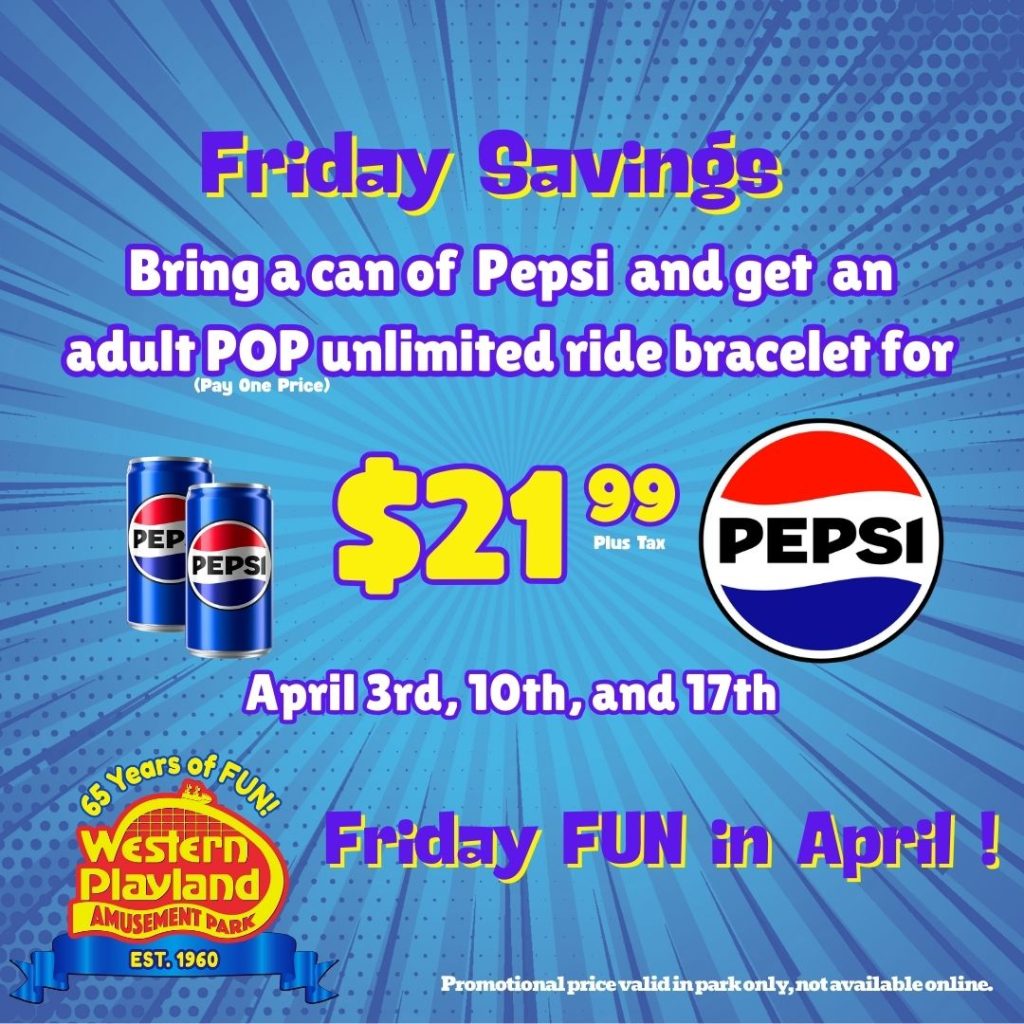 Have fun and SAVE MONEY on Fridays in April. Bring a Pepsi can and get an adult…