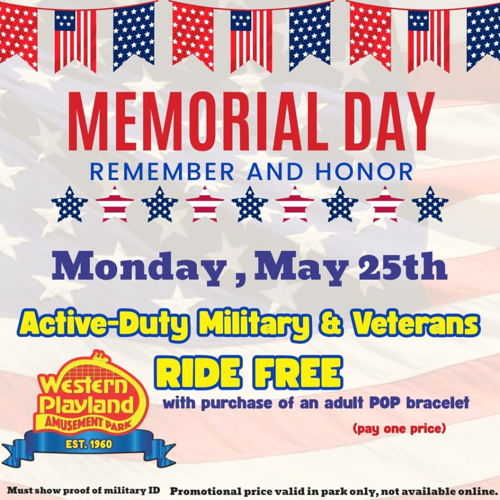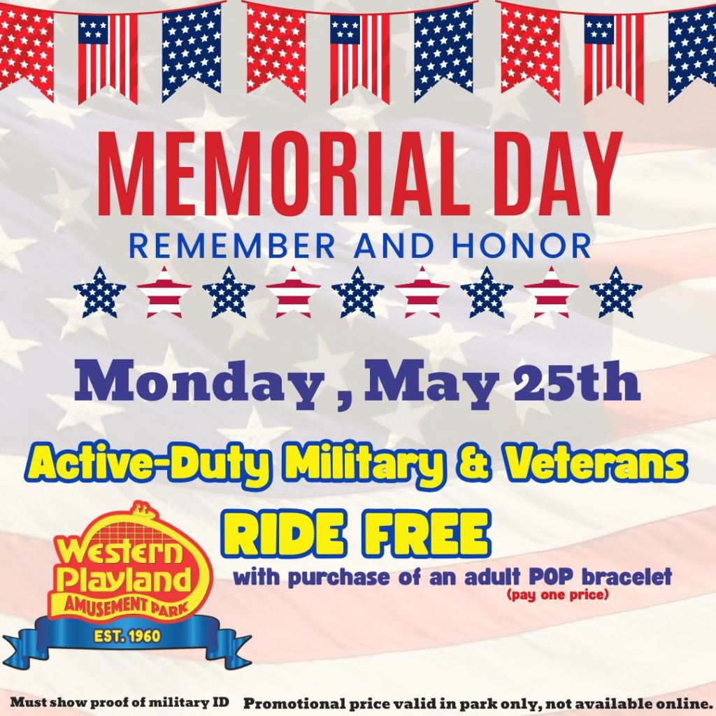 Monday, May 25th Active-Duty Military and Veterans ride FREE with purchase of an adult Pay One Price…