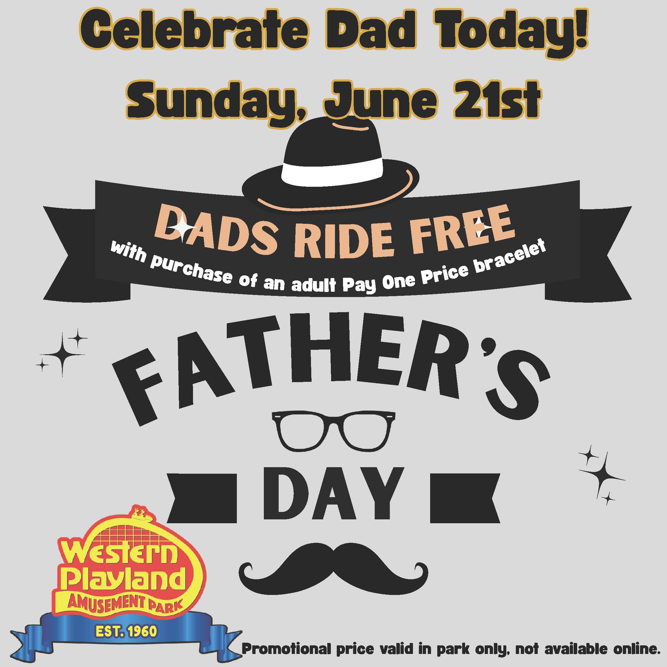 Bring your father and celebrate Father's Day at Western Playland! Fathers ride FREE with purchase of an adult Pay One Price bracelet. Unlimited fun and unlimited rides! |