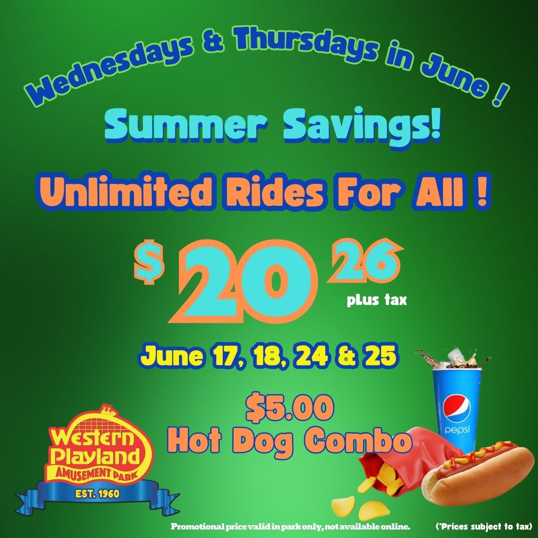 Attention Season Pass Holders! Starting June 17th, you can bring a friend to Western Playland, and they'll enjoy unlimited rides all day long for just $19.99 plus tax every Wednesday and Thursday in June and July. Have some summer fun and save. Don’t miss out!
